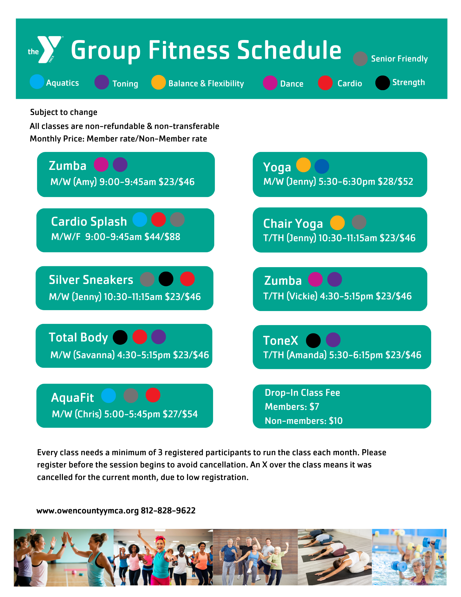 Every class needs a minimum of 3 registered participants to run the class each month. Please register before the session begins to avoid cancellation. For more information email: amy@owencountyymca.org