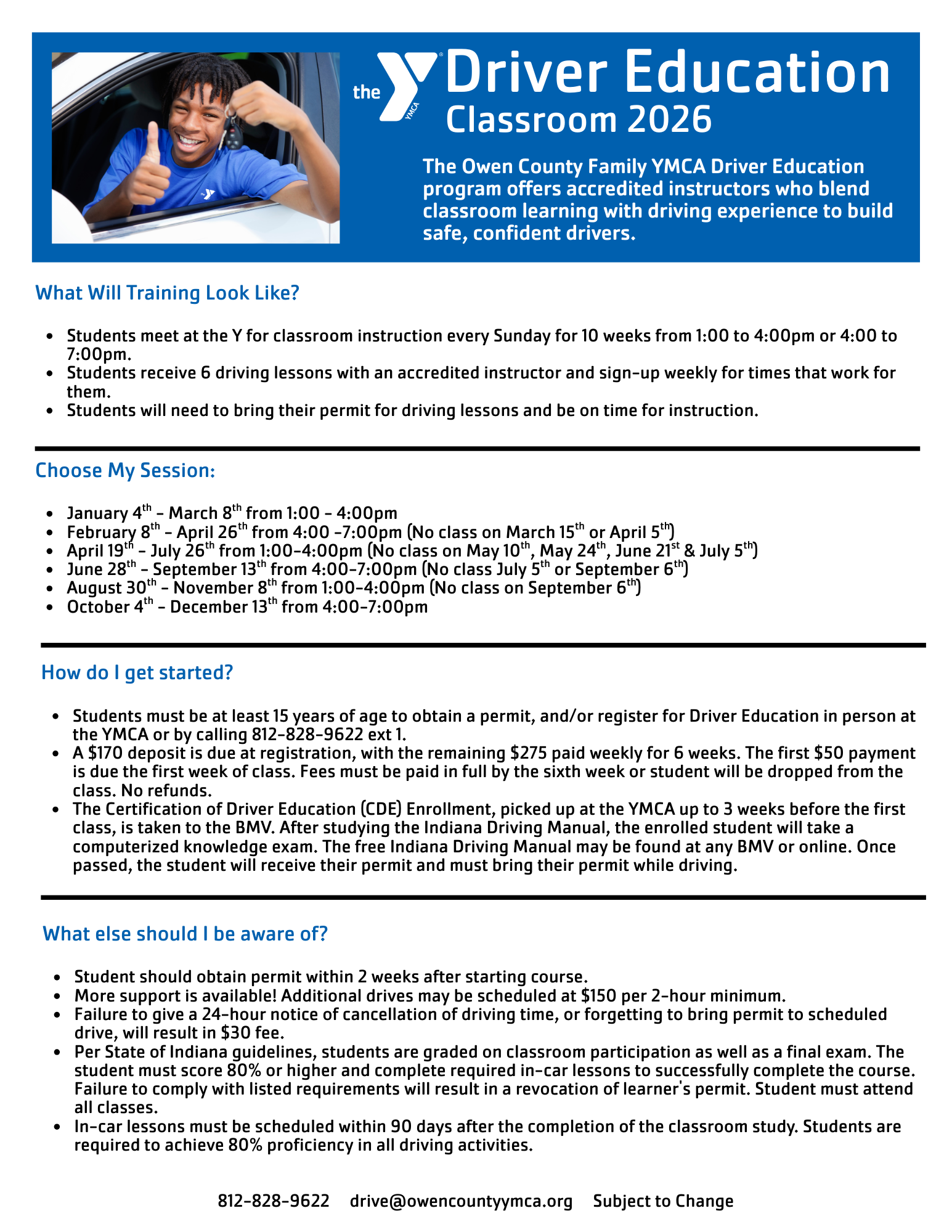 Call the Y for session availability at 812-828-9622.