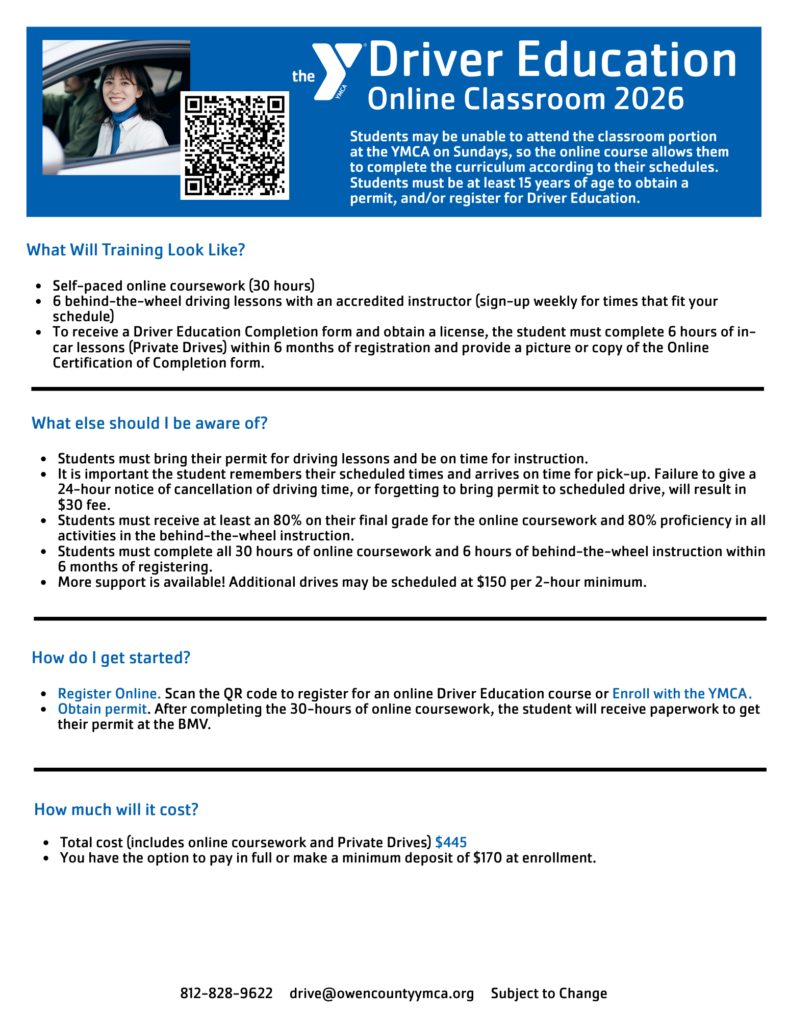 In-person classes meet at the YMCA each Sunday for 10 weeks at 1-4 pm or 4-7pm. Students are graded on classroom participation as well as a final exam.